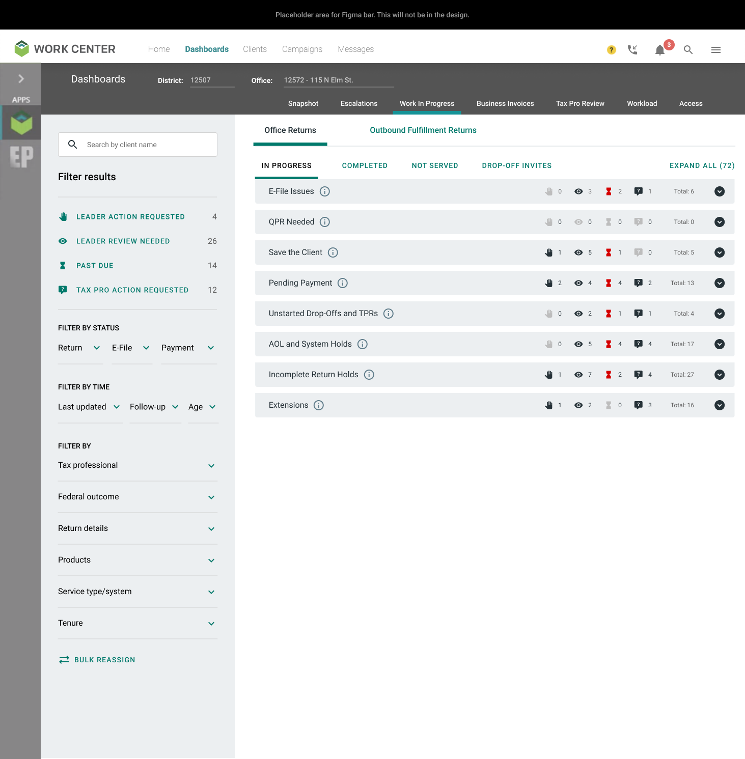 Work Center is an internal desktop application used daily by employees at H&R Block retail locations. Its purpose it to organize and view different appointments, returns, schedules, contact info for clients, and more. My main focus was on the “Work In Progress” page.